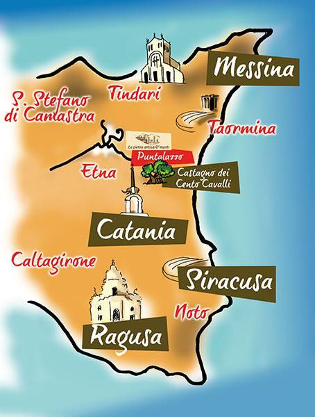 La pietra antica O’ munti se trouve en Sicile, à Puntalazzo (hameau de Mascali), une petite localité vallonnée située à environ 650 m d’altitude entre l’Etna et Taormine, une zone qui fait partie du parc naturel de l’Etna, à huit kilomètres de la mer, sur la côte orientale de la Sicile. Dans les environs de La pietra antica O’ munti, ou simplement de ses terrasses panoramiques ou de la piscine de l’établissement, on peut jouir d’un panorama fabuleux : la vue s’étend de Taormina à Augusta ; par temps clair, on peut même distinguer clairement la côte calabraise La pietra antica O’ munti est un excellent point de départ pour découvrir les nombreuses perles de la Sicile orientale, notamment des villes fascinantes comme Catane, Taormine et Syracuse.